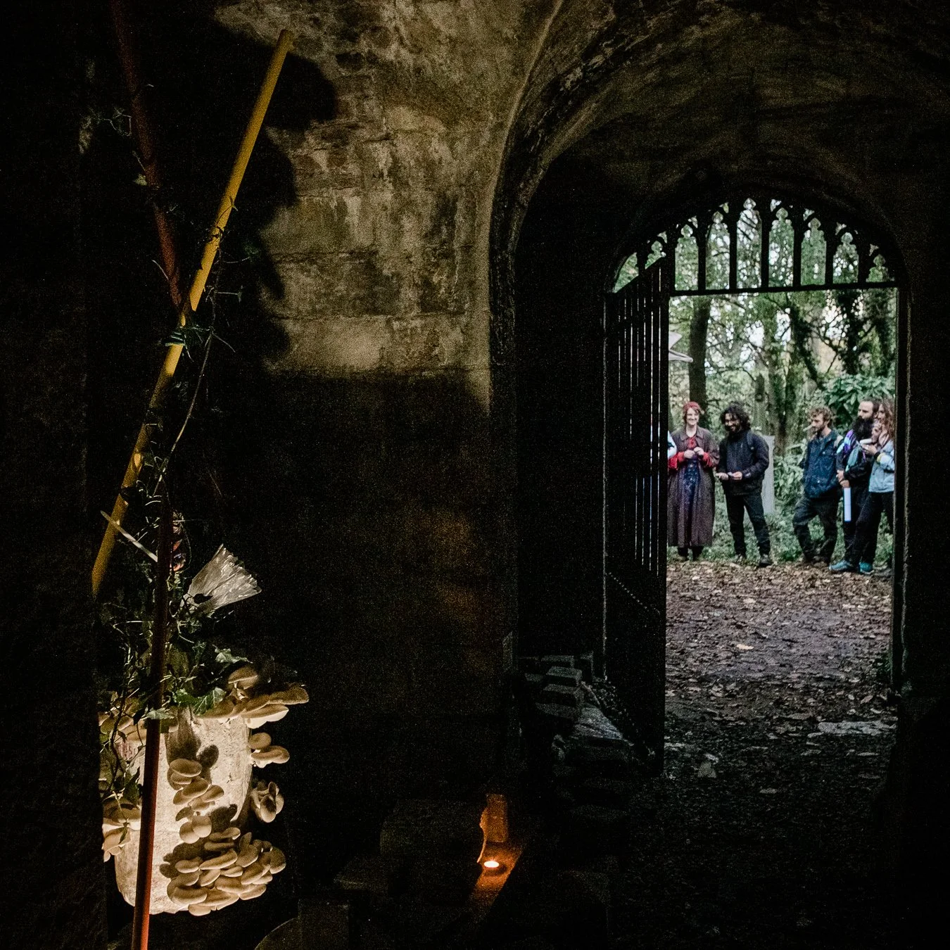 We are working with Friends of Dalry Cemetery to turn an empty crypt in the graveyard into a mushroom growing space. In Autumn 2022, we held cultivation and lab workshops with the local community, inoculating a variety of containers and logs with mushrooms which we then housed in the crypt. On the 30th October we welcomed around 100 people to the opening of the crypt, where we shared Turkey Tail tea, oyster mushroom stew and learned about the history of the cemetery.